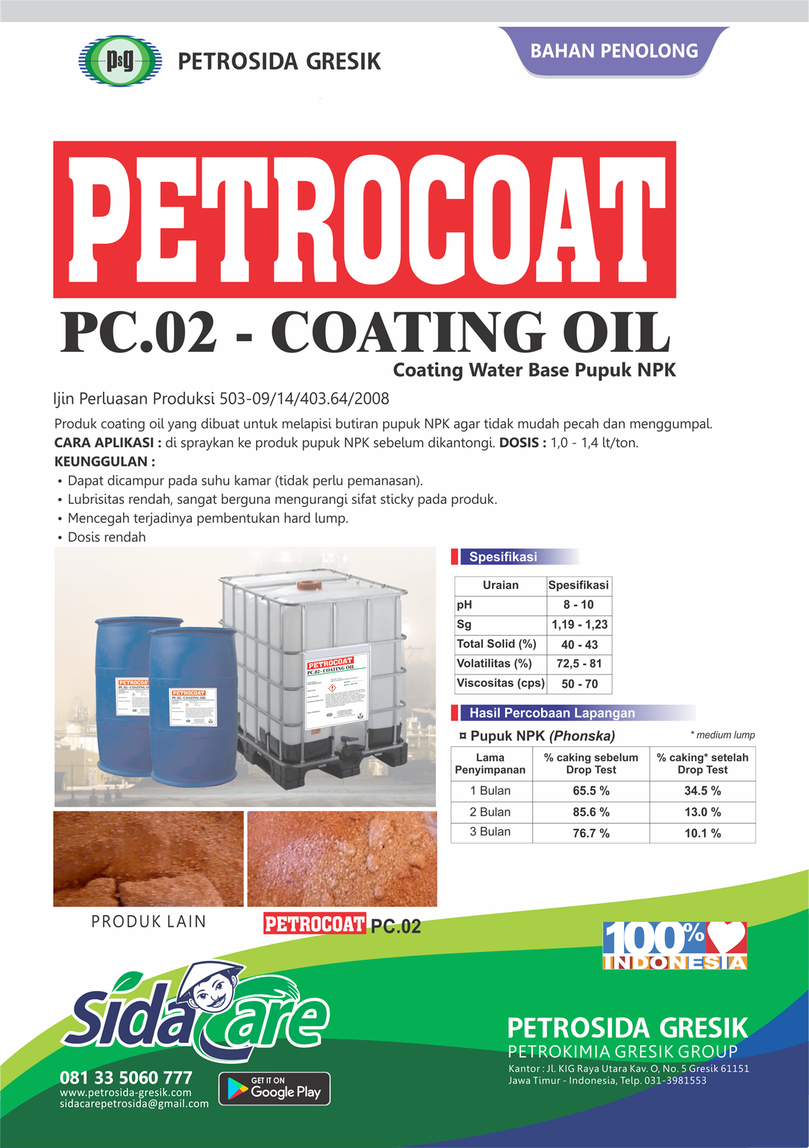 di spraykan ke produk pupuk NPK sebelum dikantongi, DOSIS 1,0 - 1,4 lt/ton.