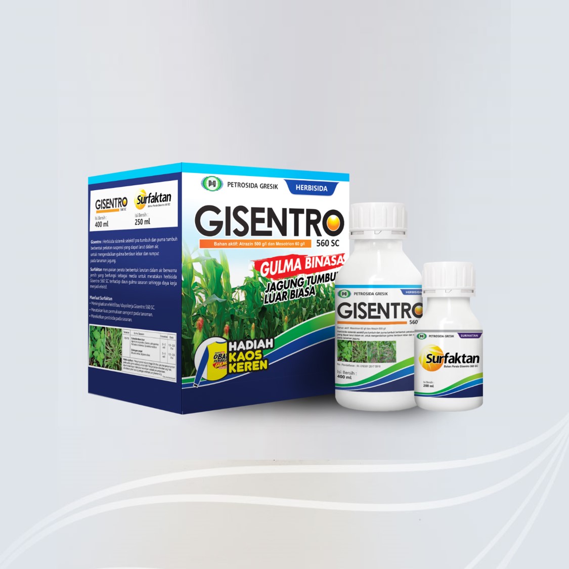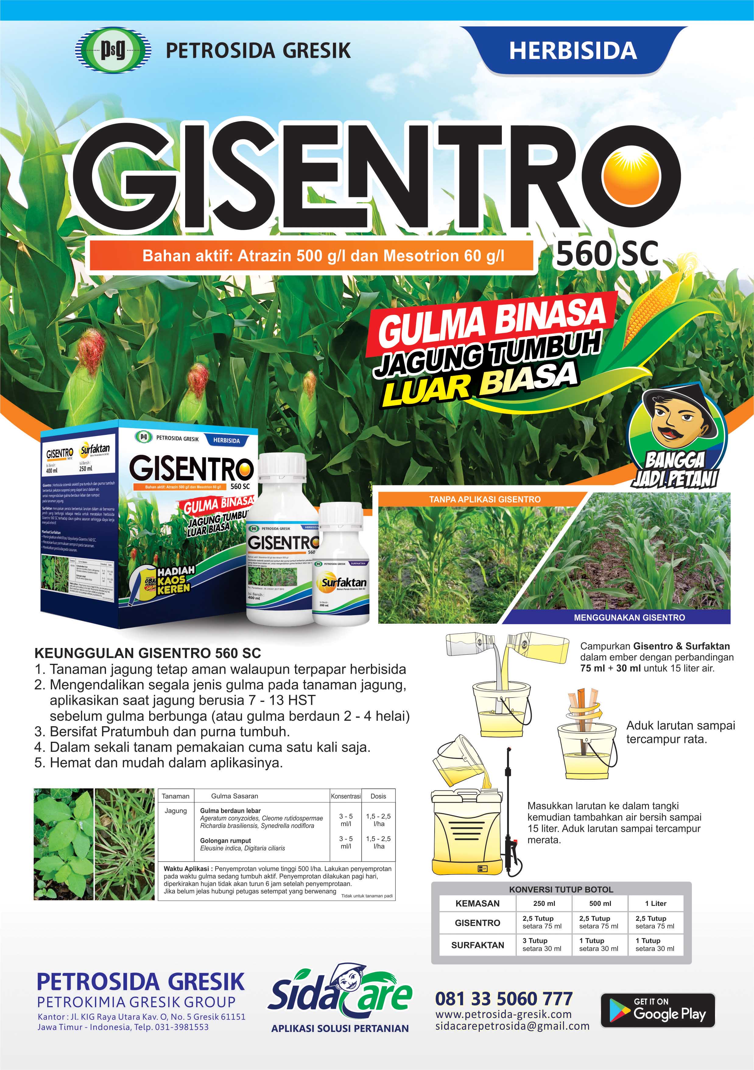 Gisentro : Herbisida sistemik selektif pra tumbuh dan purna tumbuh berbentuk pekatan suspensi yang dapat larut dalam air, untuk mengendalikan gulma berdaun lebar dan rumput pada tanaman jagung.