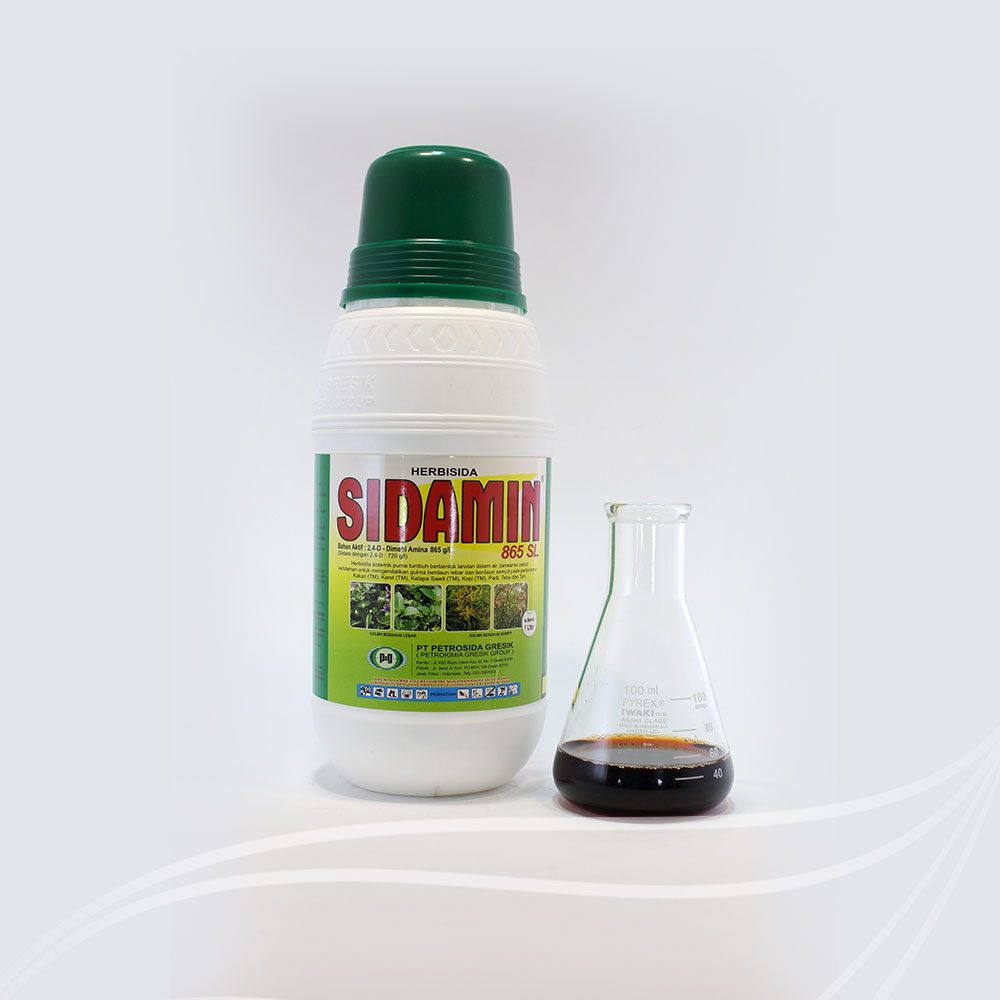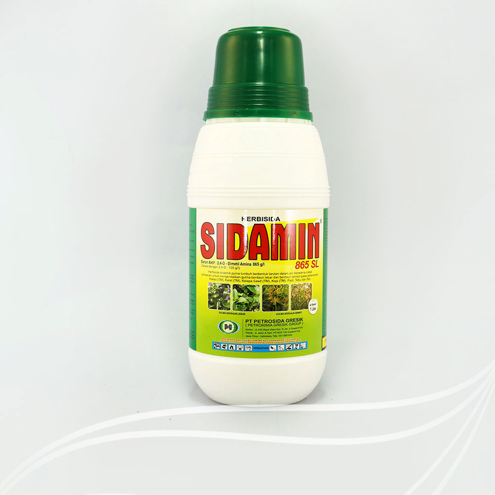 SIDAMIN 865 SL adalah herbisida sistemik selektif purna tumbuh berbahan aktif 2,4-D Dimetil Amina: 865 g/l (setara dengan 2,4-D: 720 g/l). SIDAMIN 865 SL berbentuk larutan dalam air (Soluble concentrate/SL berwarna cokelat yang efektif mengendalikan gulma berdaun lebar pada pertanaman kakao, karet, kelapa sawit, kopi, padi, tebu dan teh hingga 2 bulan.