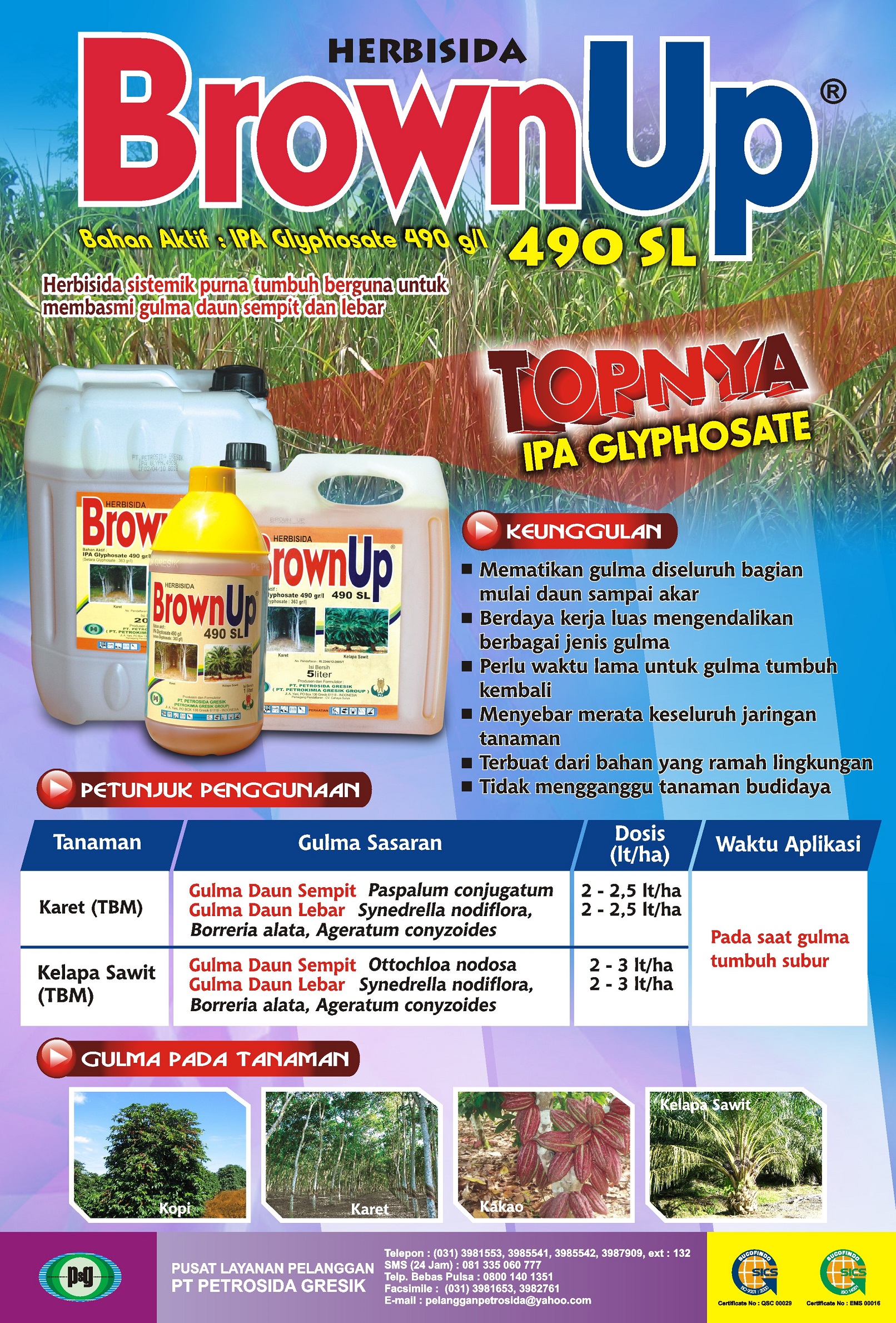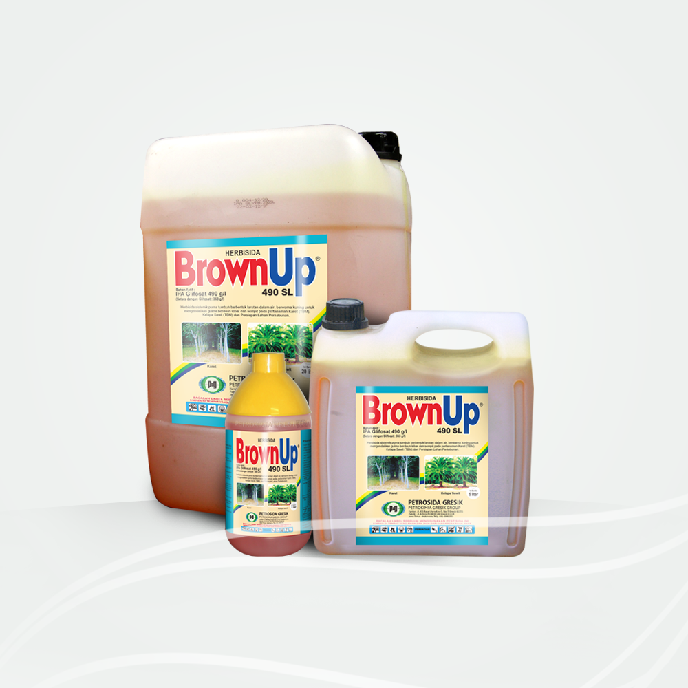 BROWNUP 490 adalah herbisida sistemik purna tumbuh berbentuk larutan dalam air (Soluble concentrate/SL ) untuk mengendalikan gulma berdaun lebar pada tanaman karet (TBM), kelapa sawit (TBM), persiapan lahan perkebunan.BROWNUP 490berbentuk larutan dalam air (Soluble concentrate/SL berwarna kuning yang efektif untuk mengendalikan gulma berdaun lebar dan sempit pada pertanaman kakao, karet, kelapa sawit, kopi dan persiapan lahan budidaya padi sawah (TOT) hingga 3-4 bulan.