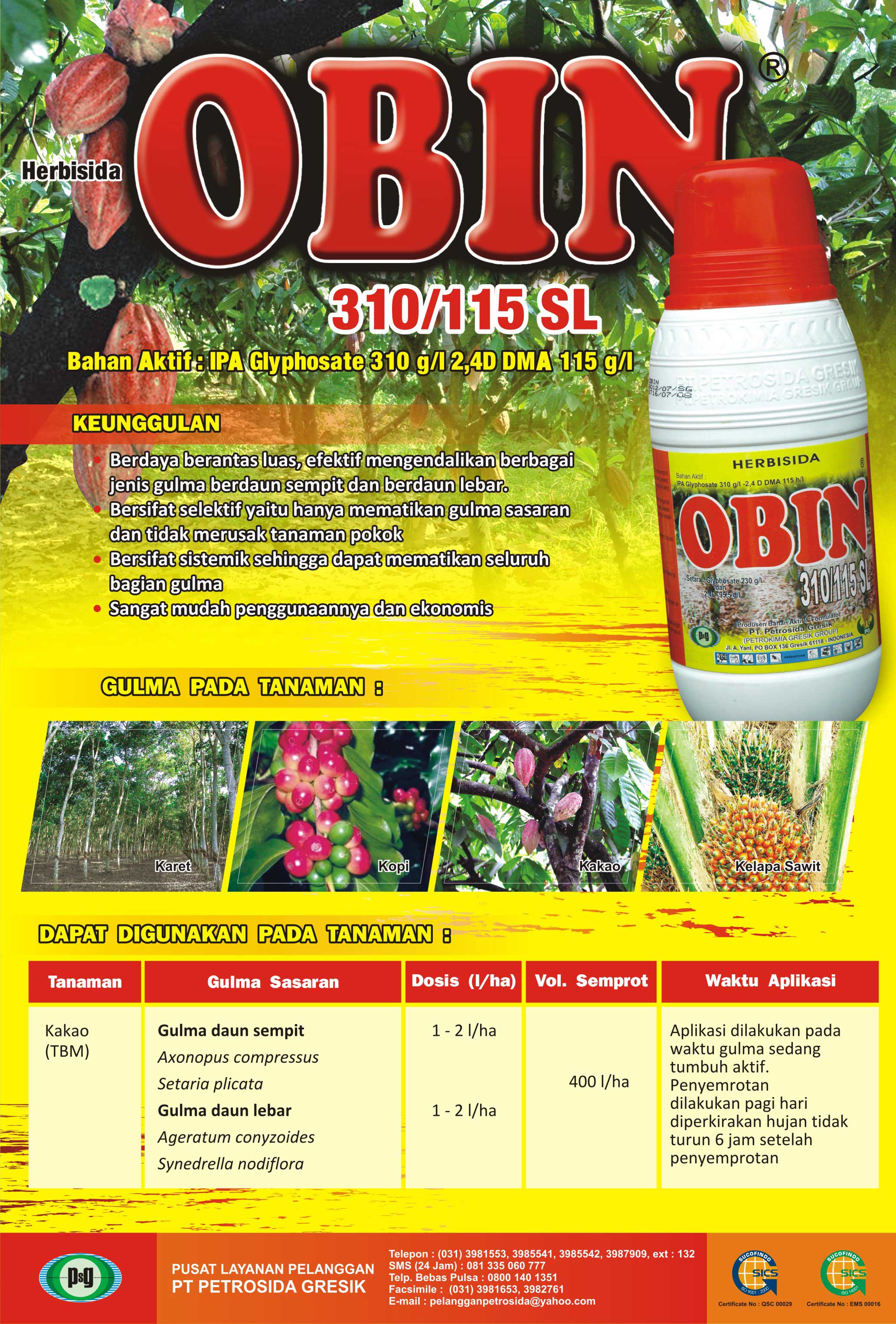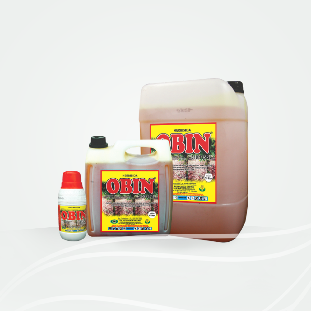 OBIN 310/ 115 SL adalah herbisida sistemik purna tumbuh berbentuk larutan dalam air (Soluble concentrate/SL ) bewarna kecoklatan untuk mengendalikan gulma berdaun lebar (Ageratum Conyzoides Synedrella Nodiflora), gulma berdaun sempit (Axonopus Compressus Setaria Plicata) pada tanaman kakao (TBM).OBIN 310/ 115 SL adalah herbisida sistemik purna tumbuh berbentuk larutan dalam air (Soluble concentrate/SL) bewarna kehijauan untuk mengendalikan gulma berdaun lebar (Ageratum Conyzoides Synedrella Nodiflora), gulma berdaun sempit (Axonopus Compressus Setaria Plicata) pada tanaman karet (TBM).