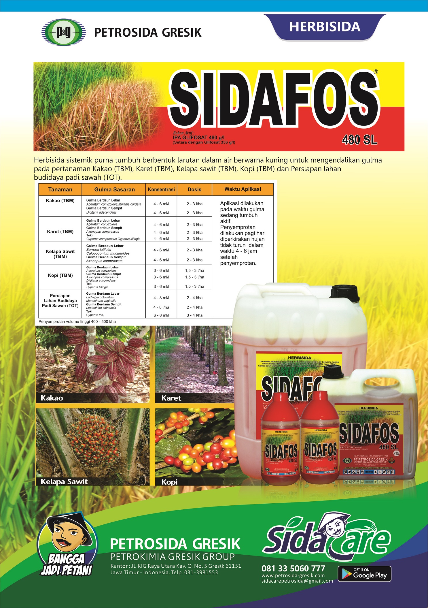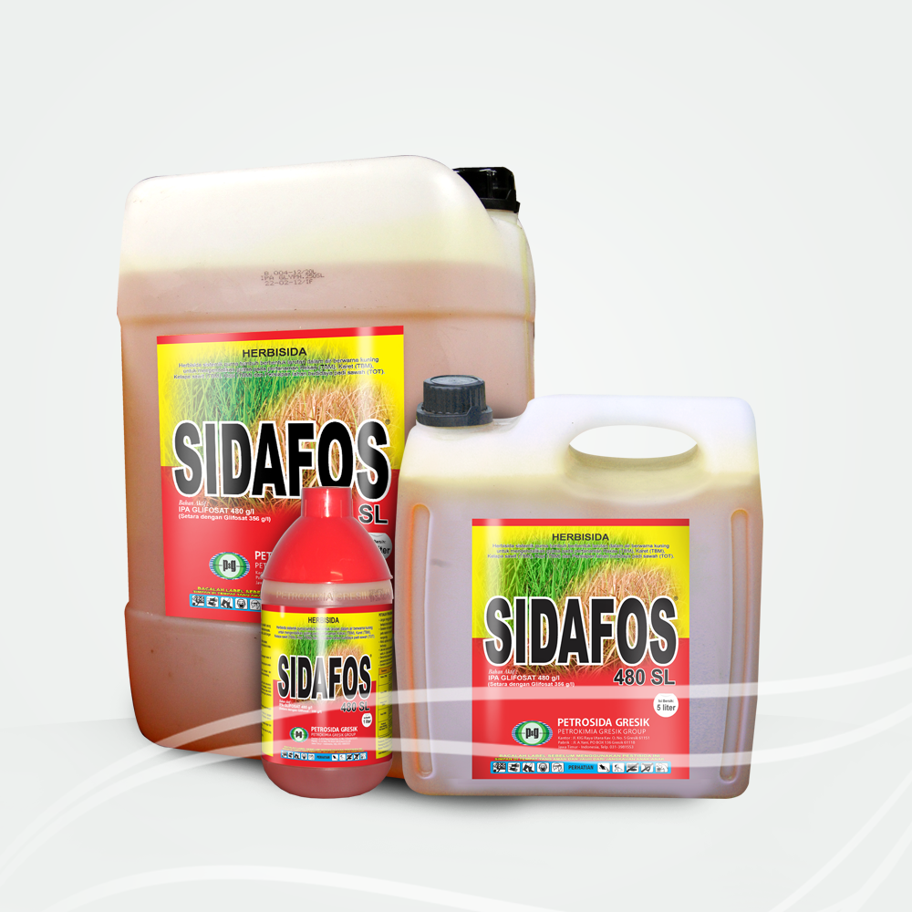 SIDAFOS 480 SL adalah herbisida sistemik purna tumbuh berbahan aktif Iso Propil Amine Glifosat: 480 g/l (setara dengan glifosat: 356 g/l). SIDAFOS 480 SL berbentuk larutan dalam air (Soluble concentrate/SL berwarna kuning yang efektif untuk mengendalikan gulma berdaun lebar dan sempit pada pertanaman kakao, karet, kelapa sawit, kopi dan persiapan lahan budidaya padi sawah (TOT) hingga 3-4 bulan.
