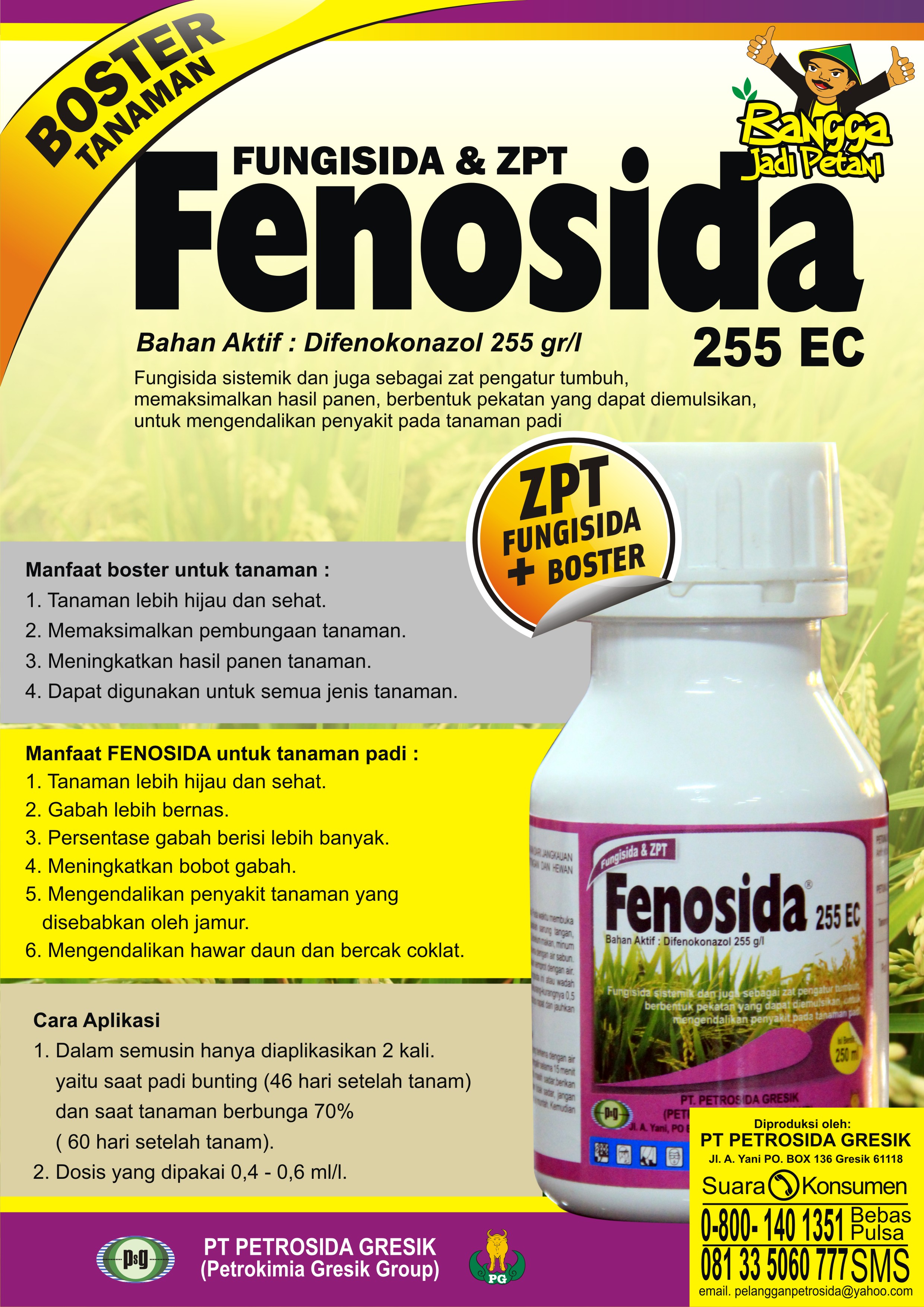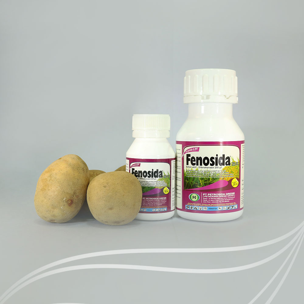 FENOSIDA 255 EC adalah fungisida bersifat sistemik, preventif dan kuratif dengan bahan aktif difenokonazol 255 g/l. FENOSIDA 255 EC berbentuk pekatan yang dapat diemulsikan (emulsifiable concentrate/EC) berwarna kuning yang diformualiskan untuk mengendalikan penyakit penting yang disebabkan oleh jamur pada pertanaman kedelai, kentang, padi dan semangka. Bahan aktif difenokonazol ditemukan pada tahun 1988 dan dalam penggolongan FRAC (Fungicide Resistance Action Committee) termasuk golongan 3, yaitu triazol. Golongan triazol merupakan fungisida penghambat demetilasi sterol, menghambat membran sel biosintesis ergosterol dan menghentikan perkembangan jamur.Fungisida ini tidak menimbulkan fitotoksik pada tanaman jika digunakan sesuai petunjuk. FENOSIDA 255 EC mudah larut dalam air dan tidak mengganggu peralatan semperot. Kelas bahaya (WHO) termasuk dalam kelas III (cukup berbahaya) dengan keterangan pernyataan bahaya yaitu “PERHATIAN” dan warna pita piktogram pada label berwarna biru tua.