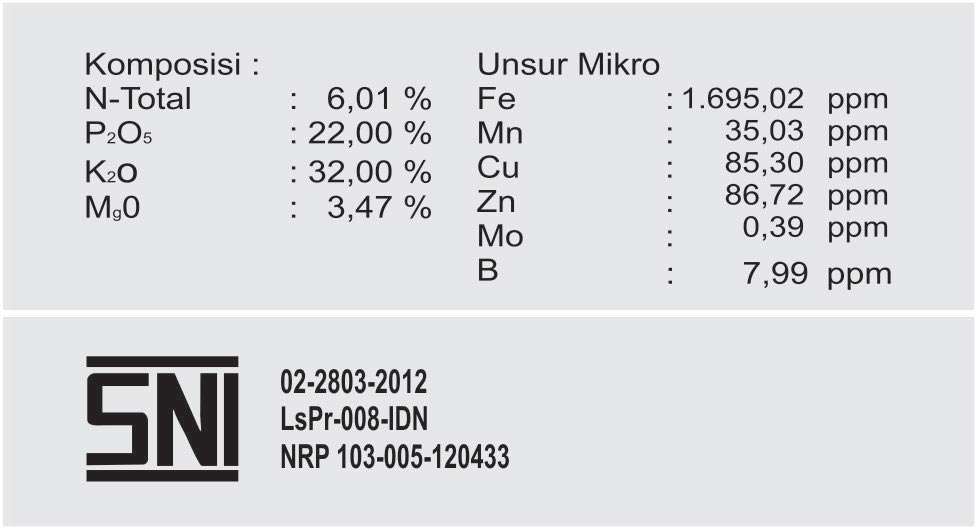 | Kandungan | Nitrogen (N), Fosfor (P2O5), Kalium (K2O) dan Magnesium (Mg) |