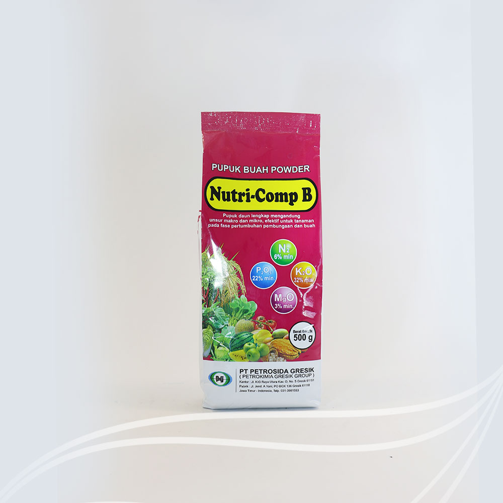 Pupuk anorganik NUTRI-COMP B adalah pupuk anorganik berbentuk tepung berwarna merah yang mengandung unsur hara makro, yaitu: Nitrogen (N): 6%, Fosfor (P2O5): 22%, Kalium (K2O): 32% dan Magnesium (Mg): 3%. Pupuk NUTRI-COMP B diformulasikan untuk mempercepat pembungaan, memperbanyak bunga, memperbesar buah, meningkatkan rasa manis buah, mencerahkan warna bunga pada tanaman hias dan meningkatkan produksi serta kualitas hasil tanaman menjadi lebih baik. Pupuk NUTRI-COMP B efektif untuk pemupukan pada tanaman yang dipanen bunganya seperti tanaman hias atau bunga potong dan tanaman yang diambil buahnya. Kelas bahaya (WHO) termasuk dalam kelas IV (tidak berbahaya pada penggunaan normal).